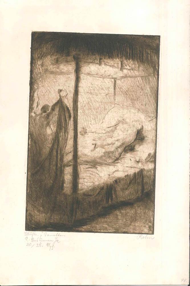 Eccezionale incisione simbolista con una nuova impressione e sottili linee di contorno, dell'incisore, scultore e pittore acquerello tedesco Walter Richard Rehn (1884-1951). "