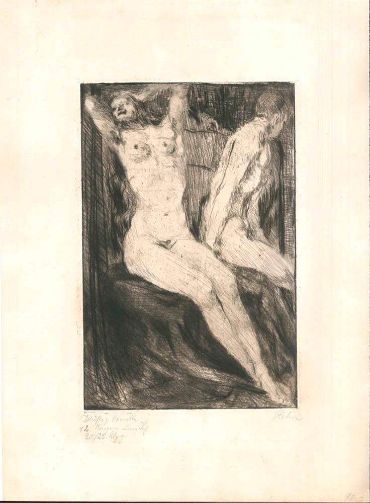 Firmato a matita sul margine inferiore destro. Intitolato e numerato a matita sul margine inferiore sinistro. Edizione di 25 stampe. Dalla serie di 18 incisioni" "Mein Weg mit dem Weib" ", pubblicata a Dresda nel 1919.