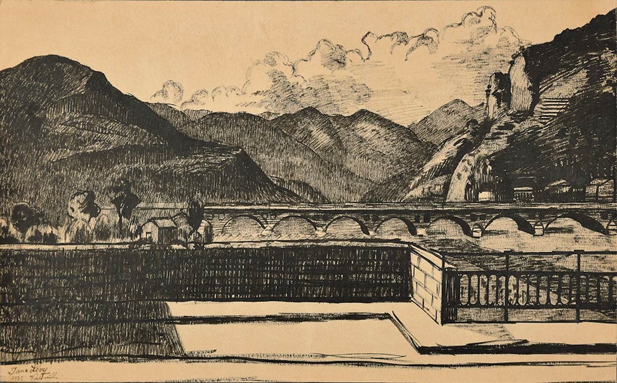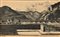 L'opera d'arte, su carta color paglia, rappresenta una vista da una grande terrazza con il ponte ferroviario, le montagne delle Alpi sullo sfondo e un cottage.