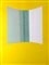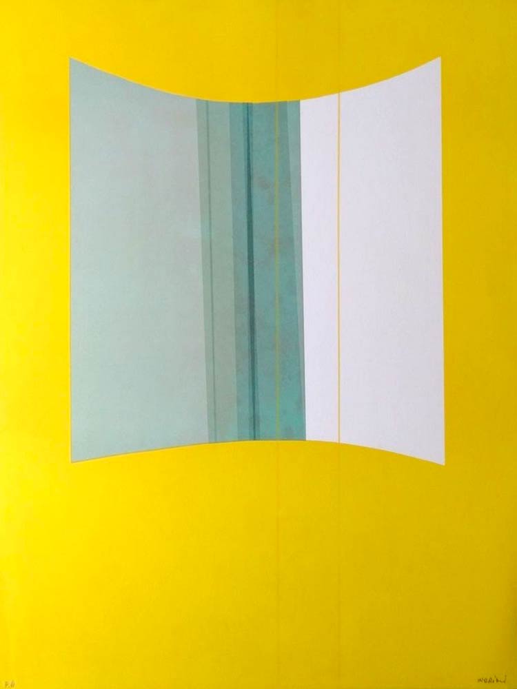 Rappresenta una composizione astratta bicolore; al centro, c'è una forma geometrica con linee gialle verticali. È composto da linee e forme minimali. Interessante è l'uso dei colori: uno sfondo giallo brillante totale contrasta con il verde chiaro della forma al centro.