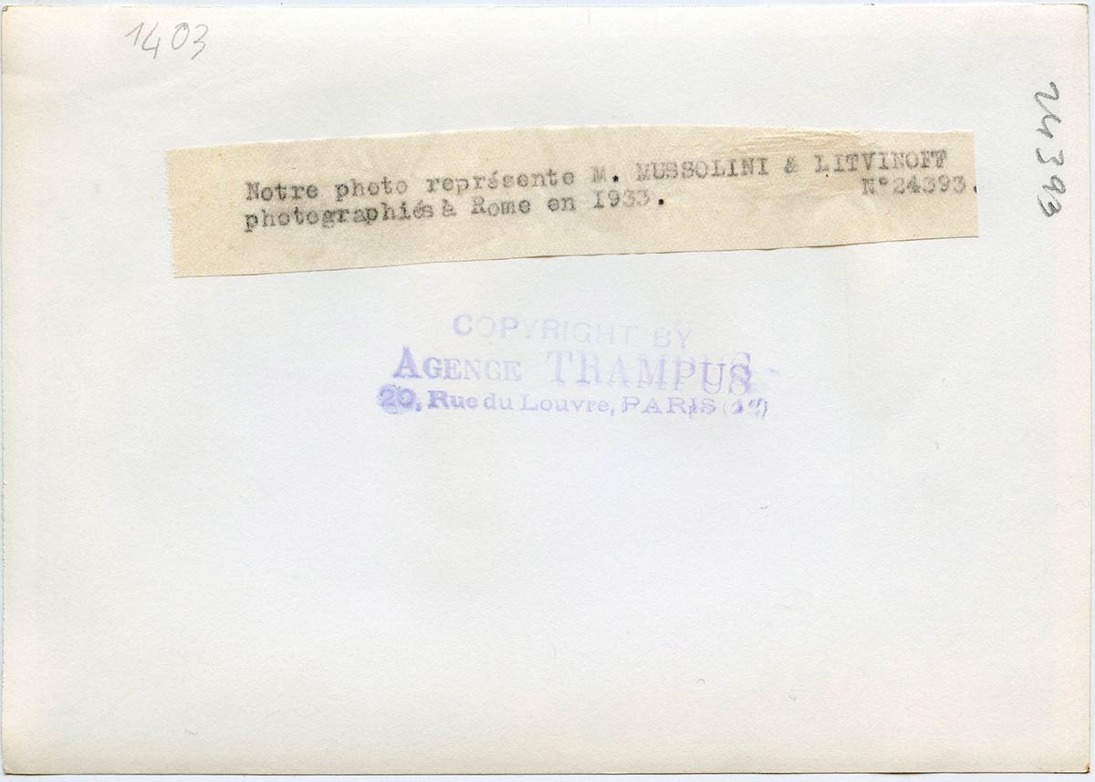 Incontro tra Mussolini e Litvinoff a palazzo Venezia. Celloidina con timbro e clichè agenzia Trampus, Paris