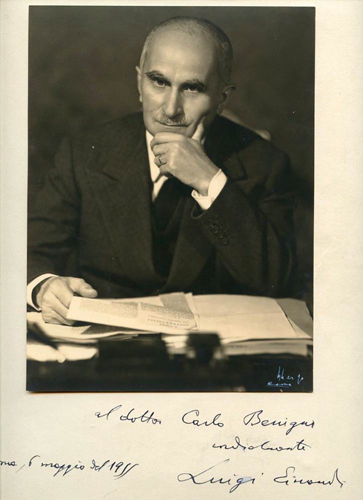 Luigi Einaudi, ritratto con dedica e autografo eseguita e firmata da Arturo Ghergo, Roma 1955. Stampa alla gelatina-bromuro su fondo baritato di qualità eccezionale, firma del fotografo a china bianca e timbro al retro. Dedica e autografo di Einaudi al fonte. Dimensioni stampa 17 x 23 cm, margini cartonato 26 x 36 cm.