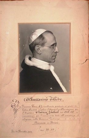 Papa Pio XII, grande ritratto con firma, e timbro papale, 1939. Stampa alla gelatina-bromuro su cartonato con intestazione ufficiale della santa sede. Timbro intestazione e firma al fronte, fotografia realizzata da Luis Baungartner. Stampa dimensioni 20 x 26 cm, passepartout 17 x 22,5 cm