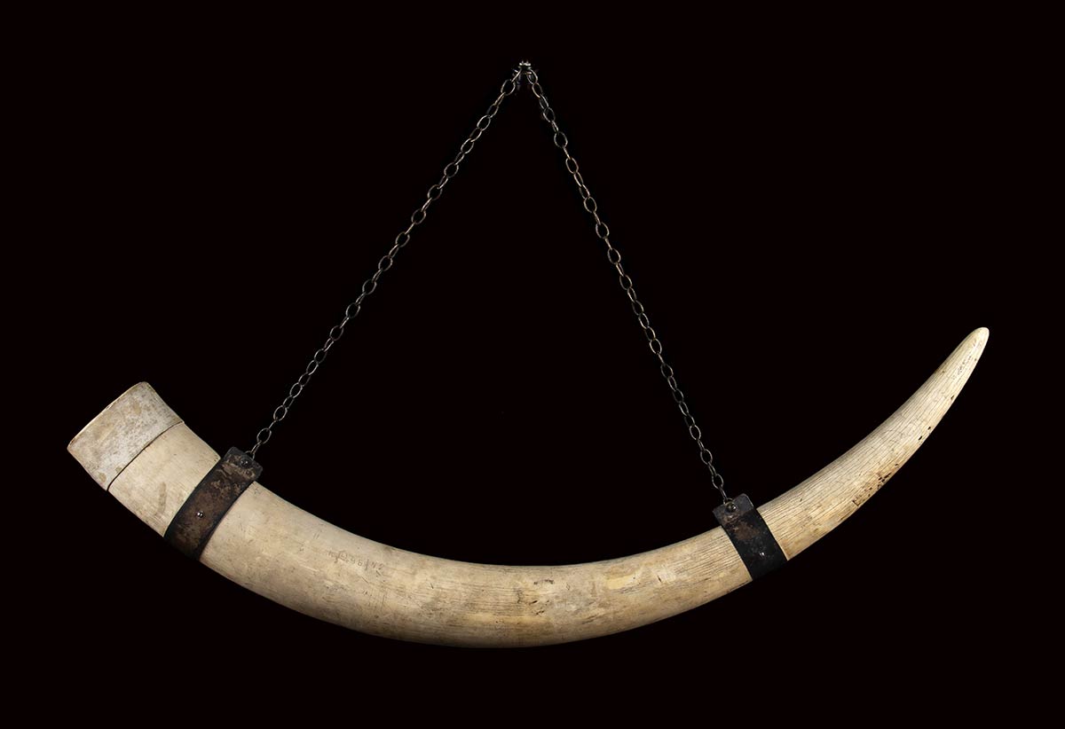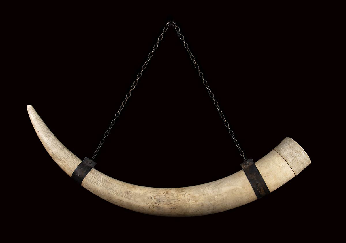 Due zanne di elefante africano da 20 Kg ciascuna montata su catene in ferro. Lunghezza alla curva esterna di metri 1,70. Documentazione CITES in allegato.