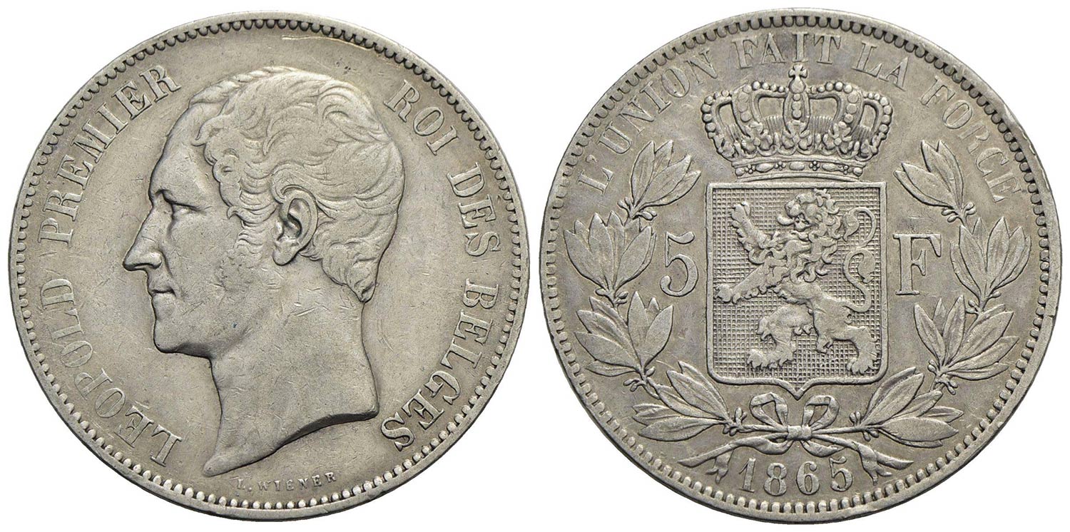 BELGIO - Leopoldo I (1831-1865) - 5 Franchi - 1865 - AG Kr. 17<br>BB+