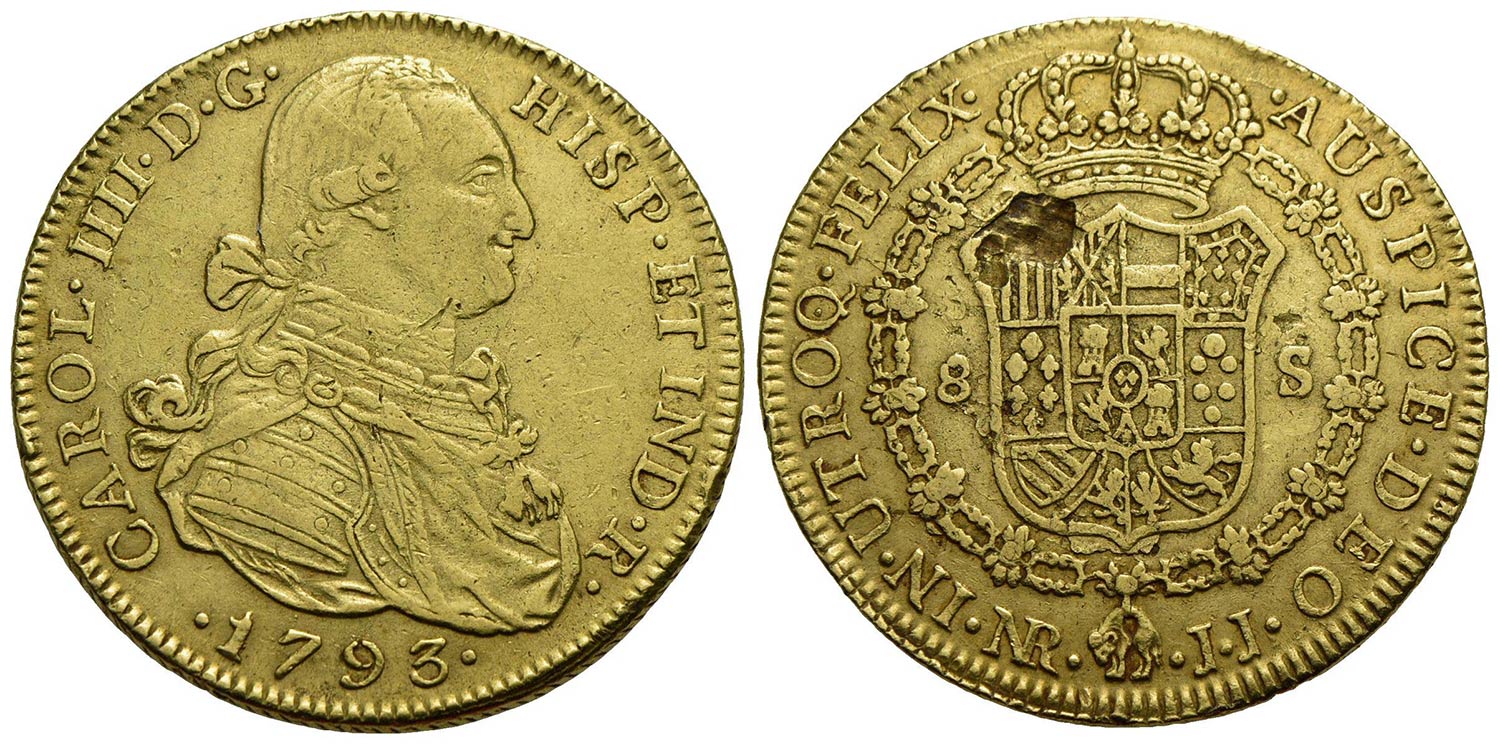 COLOMBIA - Carlo IV (1788-1808) - 8 Escudos - 1793 NR JJ - AU Kr. 62.1 Difetto di conio al R/<br>BB-