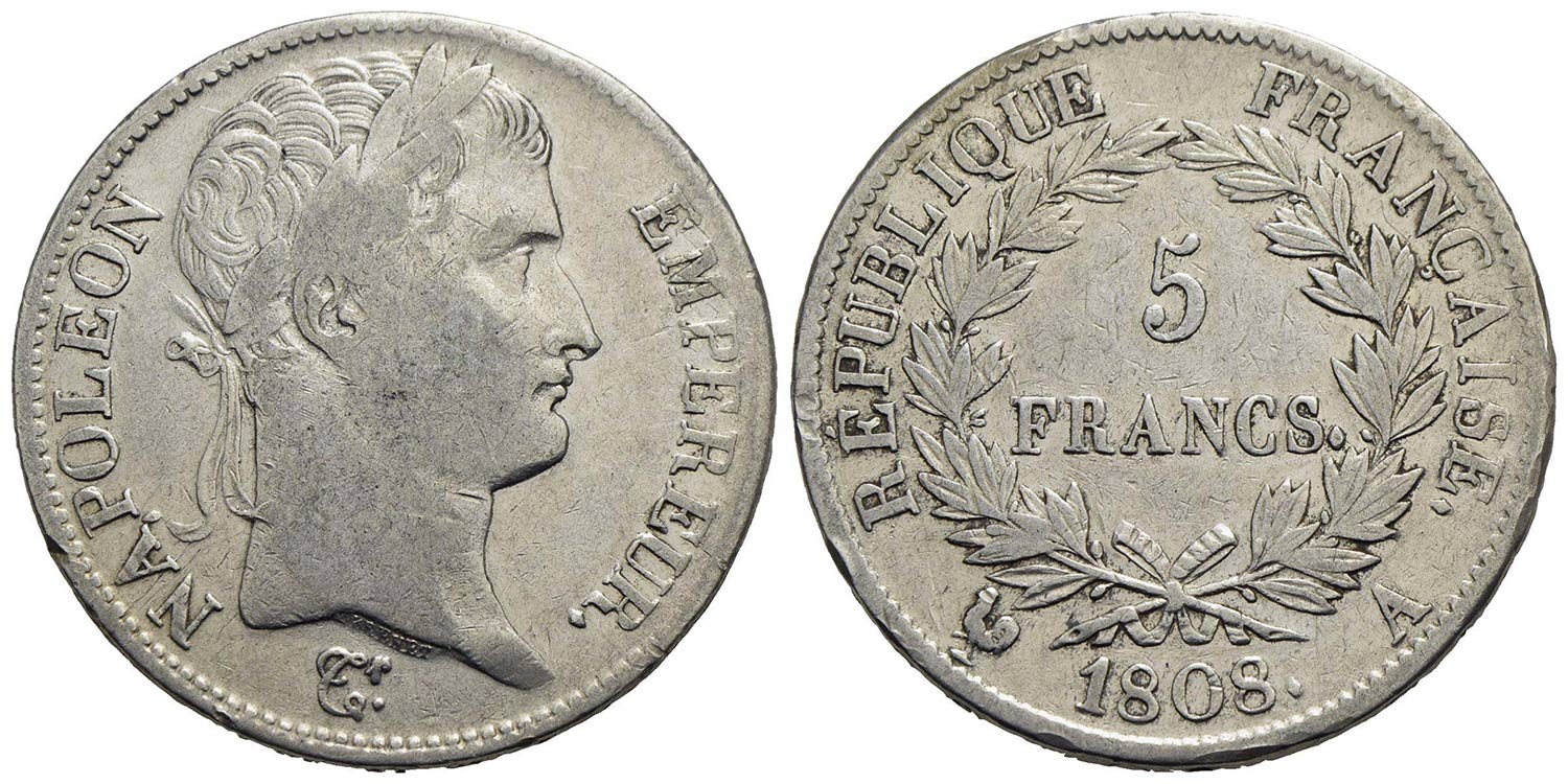 FRANCIA - Napoleone I, Imperatore (1804-1814) - 5 Franchi - 1808 A - AG Kr. 686.1<br>BB-SPL