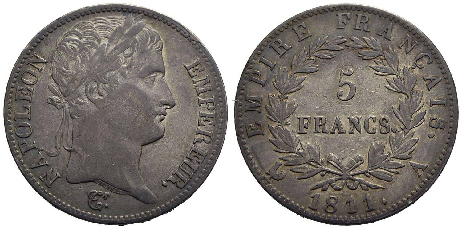 FRANCIA - Napoleone I, Imperatore (1804-1814) - 5 Franchi - 1811 A - AG Kr. 694.1 Patinata<br>BB-SPL