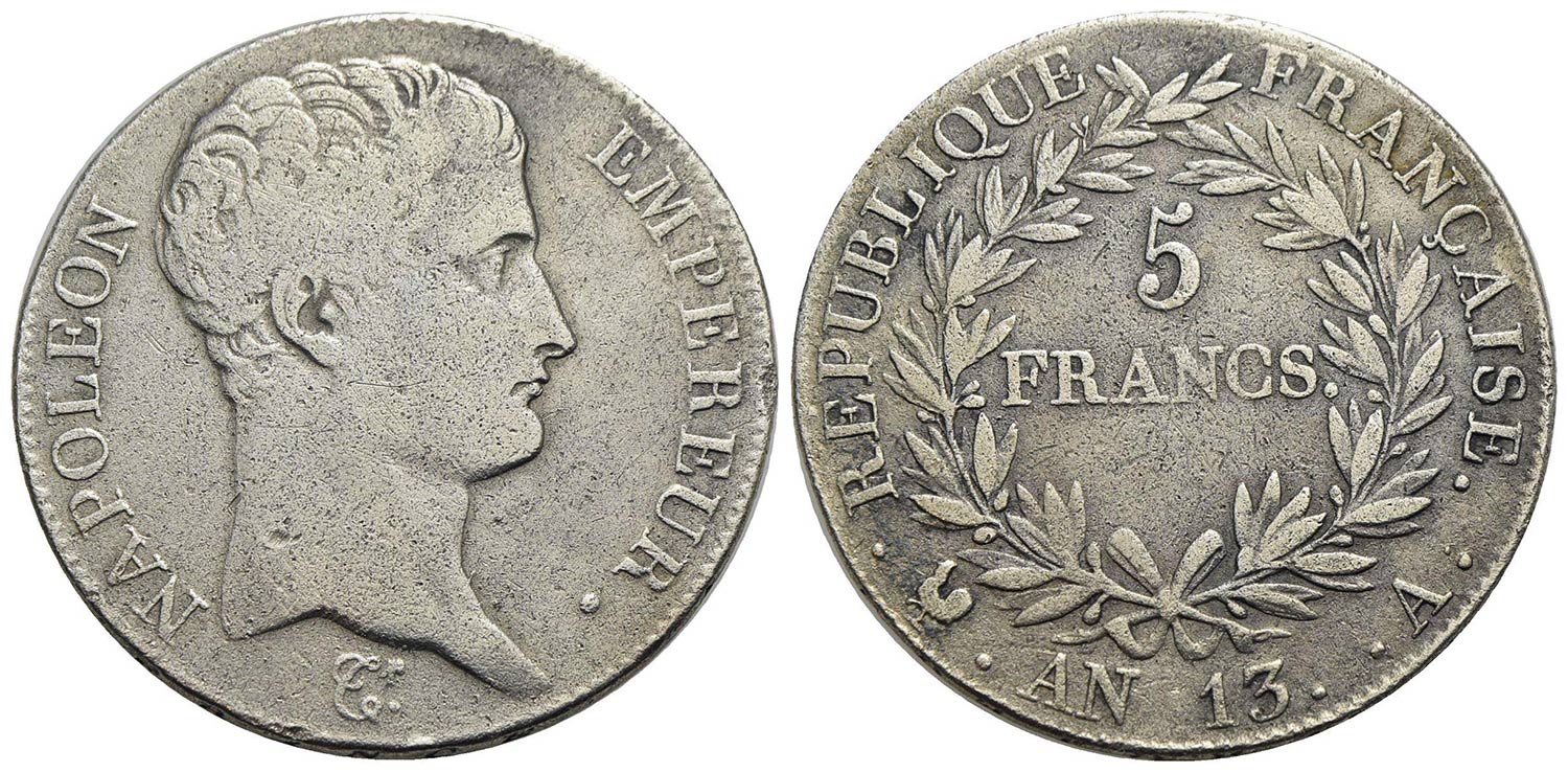 FRANCIA - Napoleone I, Imperatore (1804-1814) - 5 Franchi - AN 13 A - AG Kr. 662.1<br>qBB/BB