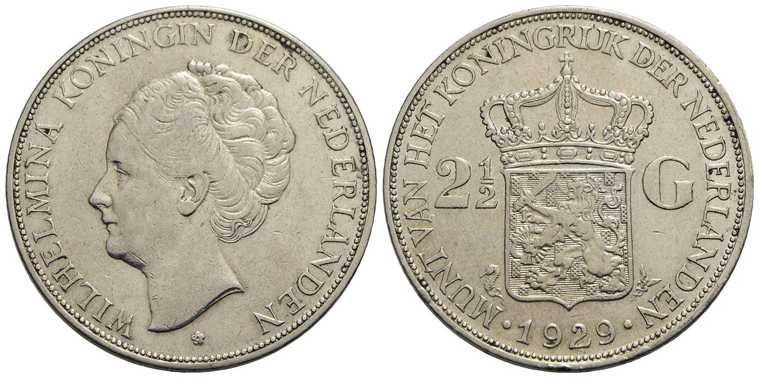 OLANDA - Guglielmina (1890-1948) - 2,5 Gulden - 1929 - AG NC Kr. 165<br>BB+