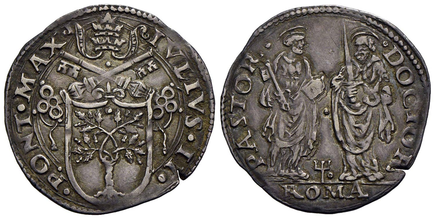 ROMA - Giulio II (1503-1513) - Giulio - Stemma a targa semiovale - R/ Figure affrontate di San Pietro e San Paolo - (AG g. 3,82) RR CNI 91; Munt. 25 Patina di antica raccolta