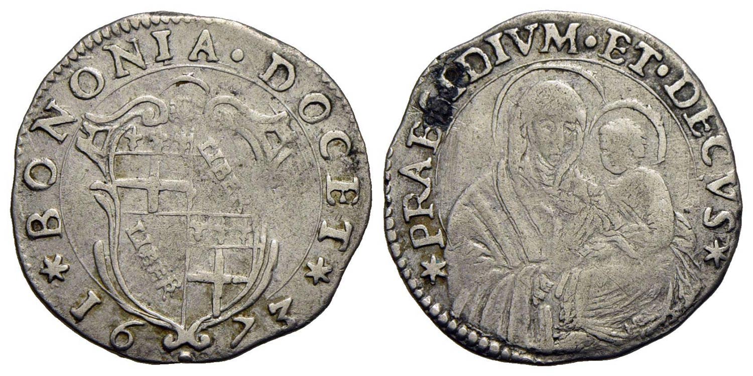 BOLOGNA - Clemente X (1670-1676) - Carlino - 1673 - Stemma ovale in cornice - R/ Mezza figura della Madonna con il Bambino - (AG g. 1,76) R CNI 35; Munt. 59a