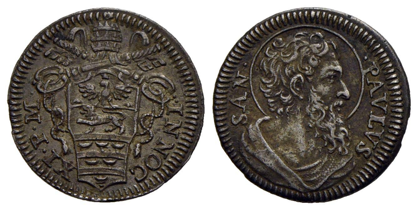 ROMA - Innocenzo XI (1676-1689) - Mezzo grosso - Stemma poligonale - R/ Busto del Santo a d. con nim
