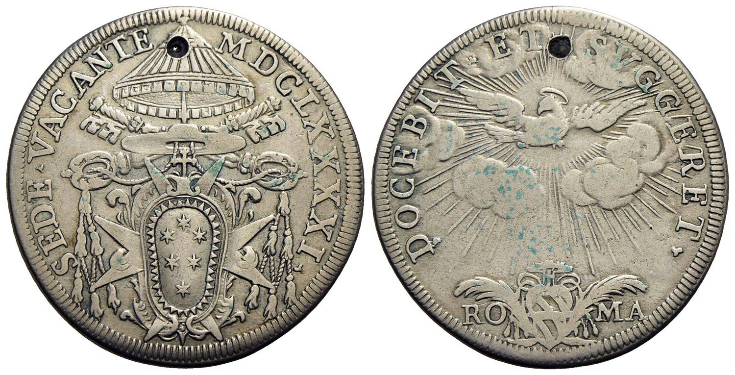 ROMA - Sede Vacante (1691) - Testone - 1691 - Stemma sormontato da tiara e chiavi - R/ La colomba dello Spirito Santo - (AG g. 8,8) CNI 2; Munt. 2 Foro otturato