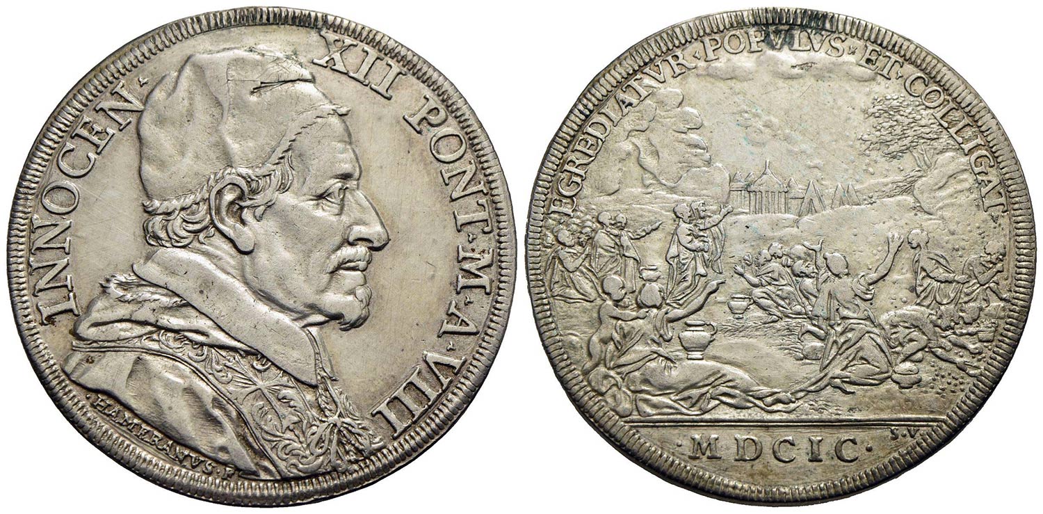 ROMA - Innocenzo XII (1691-1700) - Piastra - 1699 A. VIII - Busto a d. con camauro - R/ La raccolta della manna - (AG g. 31,9) RR CNI 120; Munt. 17 Foro abilmente otturato