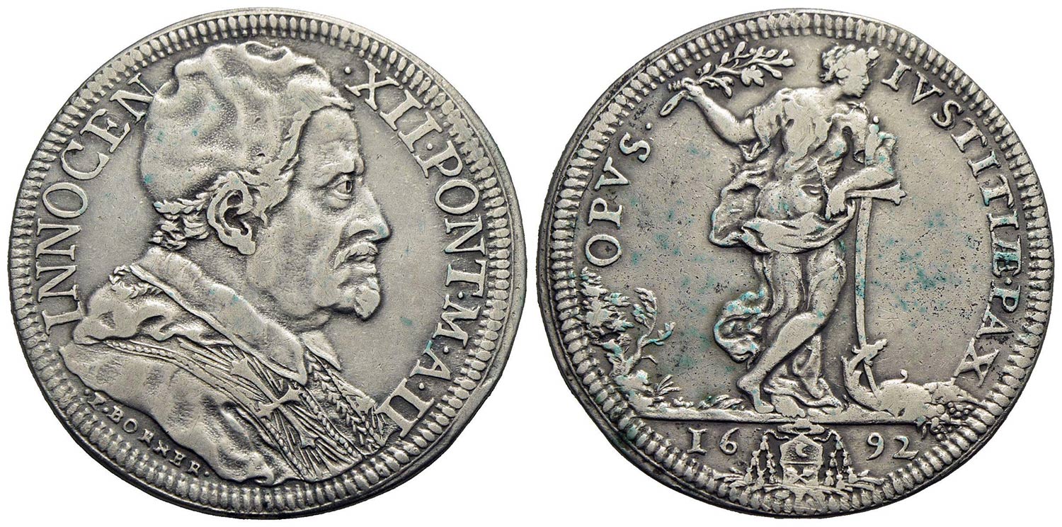 ROMA - Innocenzo XII (1691-1700) - Mezza piastra - 1692 A. II - Busto a d. con camauro - R/ Figura della Pace - (AG g. 15,86) CNI 27; Munt. 35 var. I