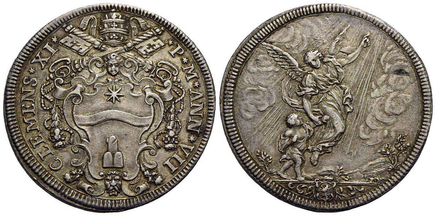 ROMA - Clemente XI (1700-1721) - Mezza piastra - A. VII - Stemma a targa sagomata - R/ Tobia e l'Angelo - (AG g. 16,15) RR CNI 95; Munt.58