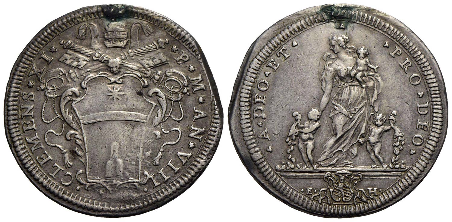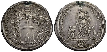 ROMA - Clemente XI (1700-1721) - Testone - A. VIII - Stemma poligonale, serafino in cimasa; chiavi con impugnatura ovale a due lobi decussate e tiara - R/ Carità con fanciullo in braccio - (AG g. 9,05) R Ser. 92; Munt. 60 Appiccagnolo rimosso