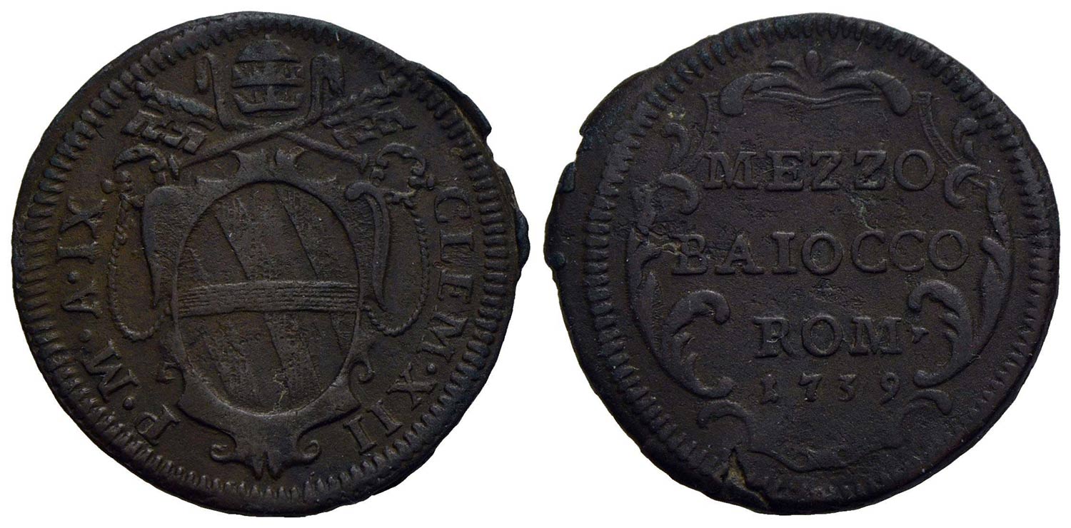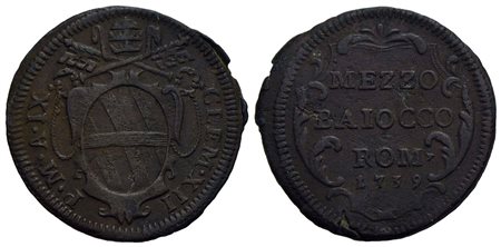 ROMA - Clemente XII (1730-1740) - Mezzo baiocco - 1739 A. IX - Stemma ovale in cornice - R/ Scritta in cartella di fogliami - (CU g. 5,09) CNI 200; Munt. 152