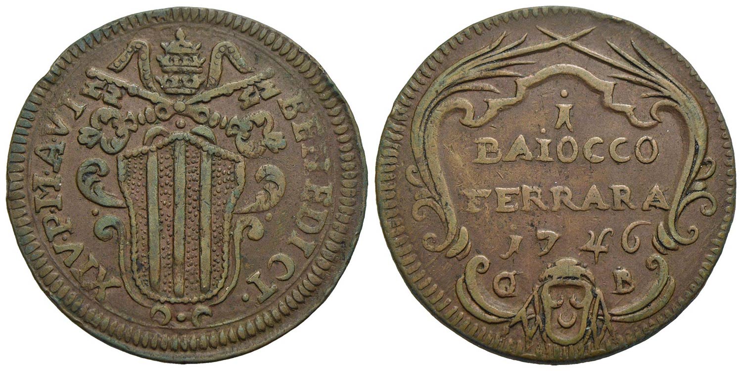 FERRARA - Benedetto XIV (1740-1758) - Baiocco - 1746 A. VI - Stemma - R/ Scritta su tre righe - (CU g. 10,52) R CNI 42; Munt. 242
