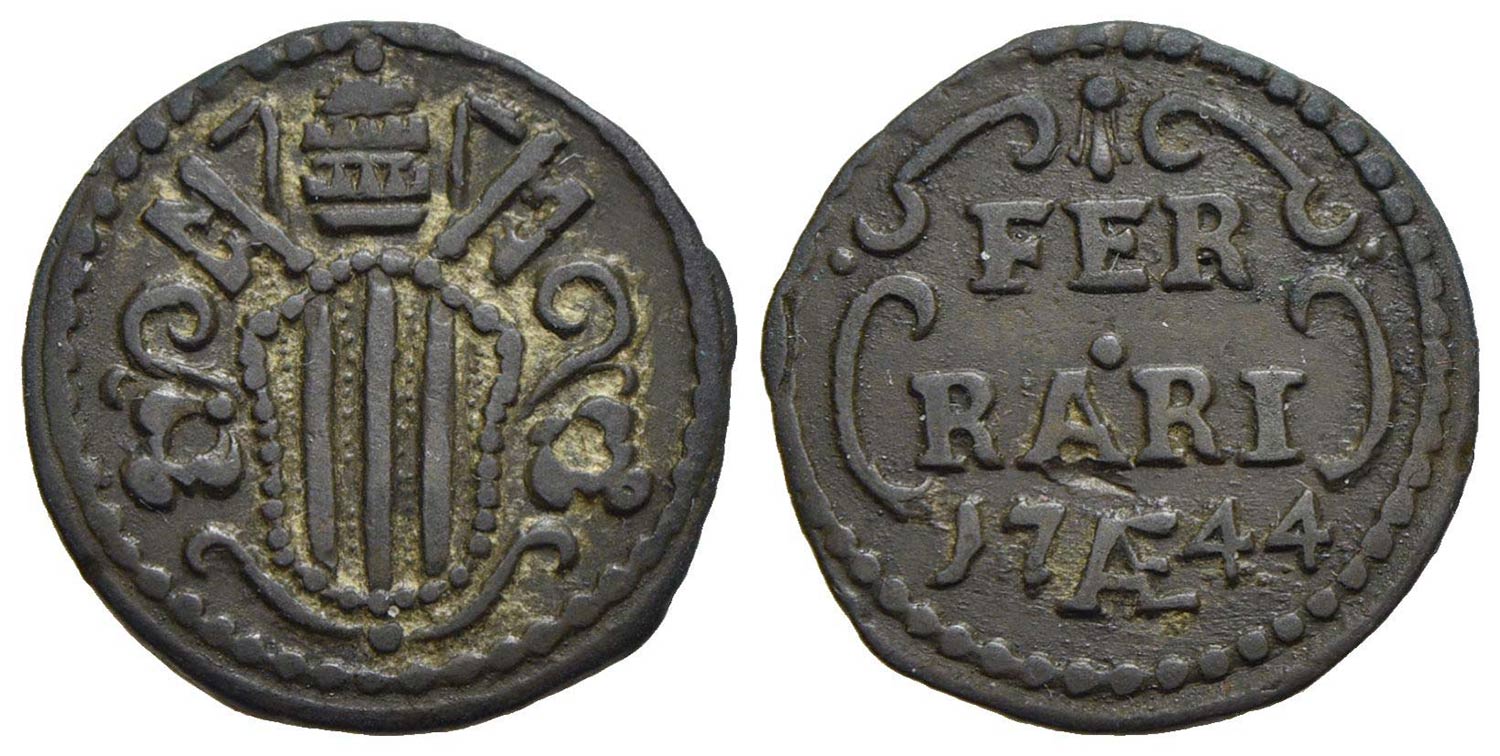 FERRARA - Benedetto XIV (1740-1758) - Quattrino - 1744 - Stemma - R/ Scritta su tre righe - (CU g. 1,89) Ser. 1414; Munt. 388