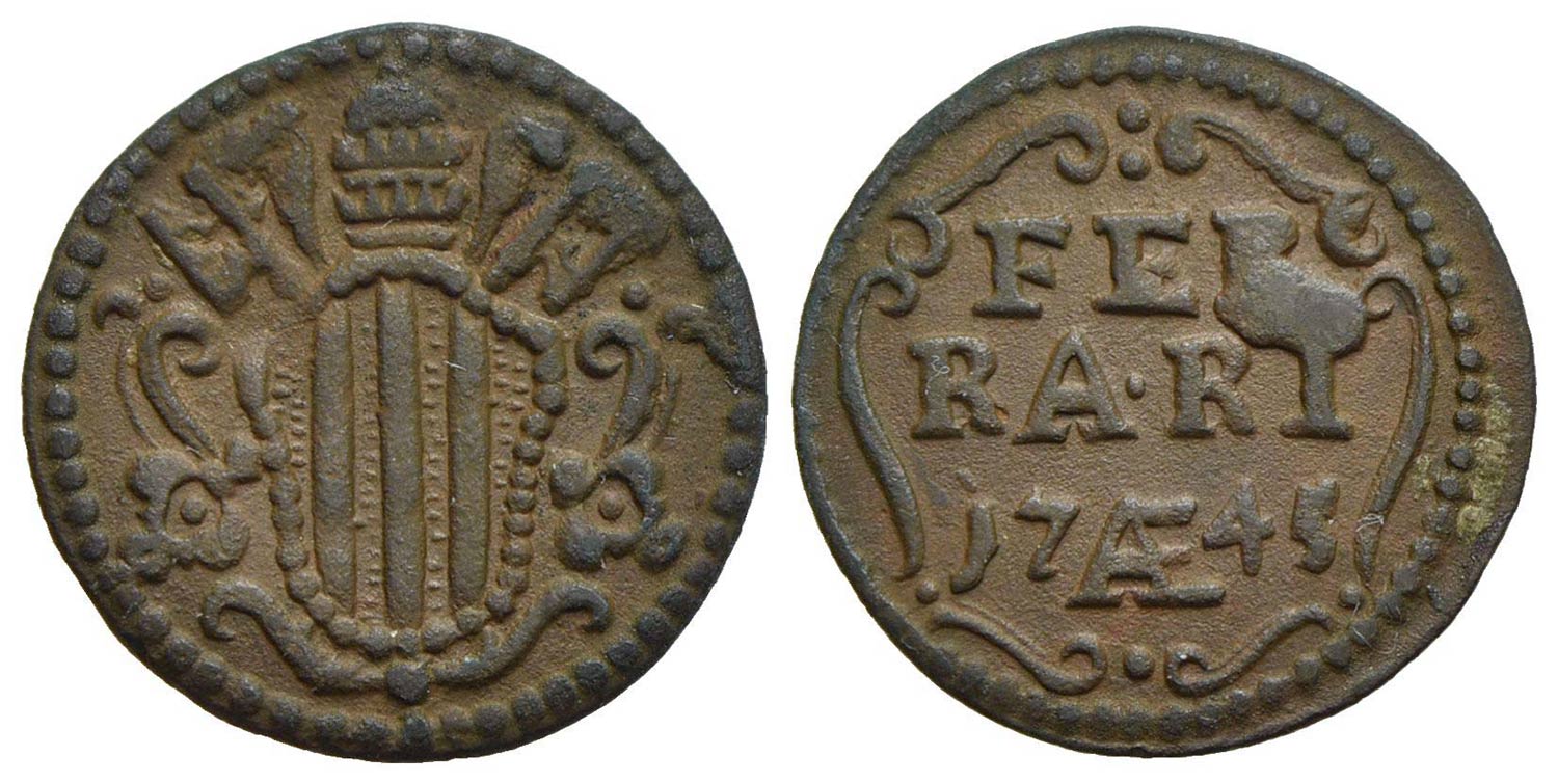 FERRARA - Benedetto XIV (1740-1758) - Quattrino - 1745 - Stemma largo a targa - R/ Scritta in cartella - (CU g. 1,52) R CNI 38; Munt. 391