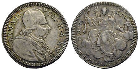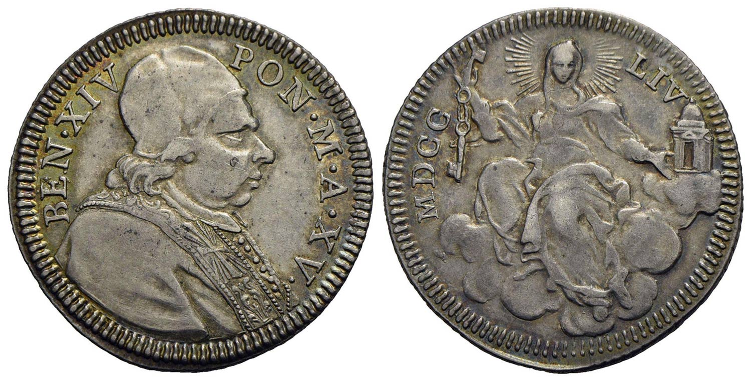 ROMA - Benedetto XIV (1740-1758) - Quinto di scudo - 1754 A. XV - Busto a d. con camauro - R/ La Chi
