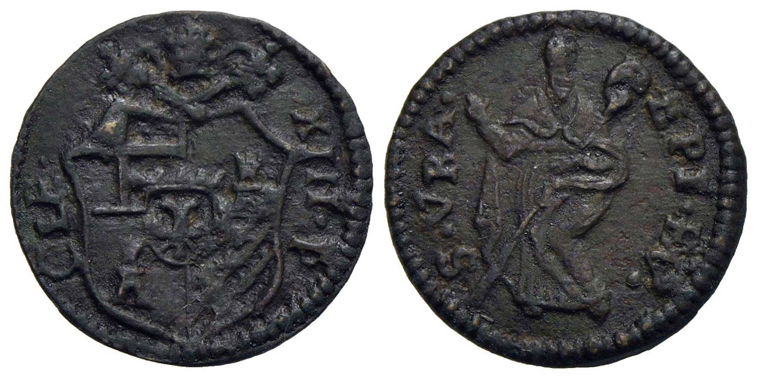 GUBBIO - Clemente XIII (1758-1769) - Quattrino - Stemma poligonale - R/ S. Ubaldo con pastorale obliquo - (CU g. 2,43) R CNI 30; Munt. 56 var. VI