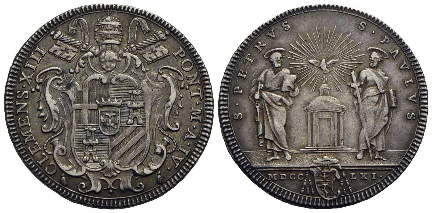 Lot 646 | ROMA - Clemente XIII (1758-1769) - Testone - 1761 A. IV - Stemma sormontato da tiara e chiavi decuss