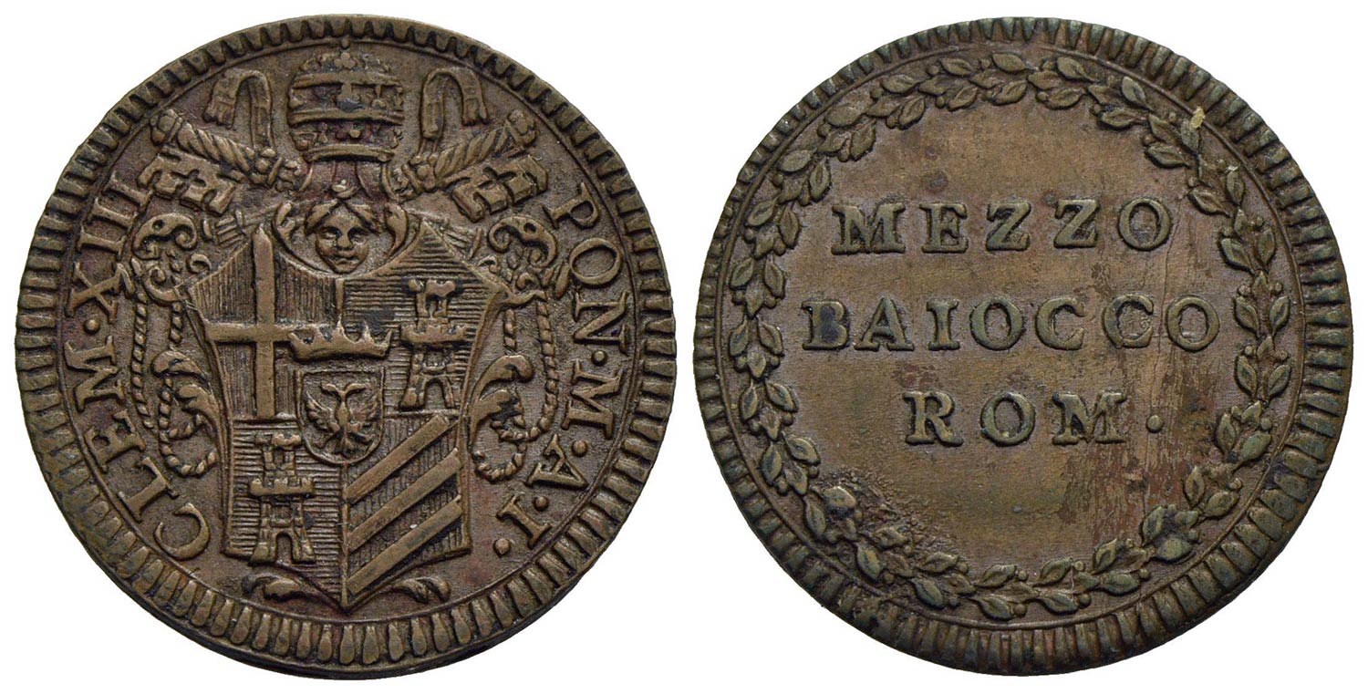 ROMA - Clemente XIII (1758-1769) - Mezzo baiocco - A. I - Stemma a targa poligonale - R/ Scritta in ghirlanda sinistrorsa - (CU g. 5,61) R Ser. 121; Munt. 39