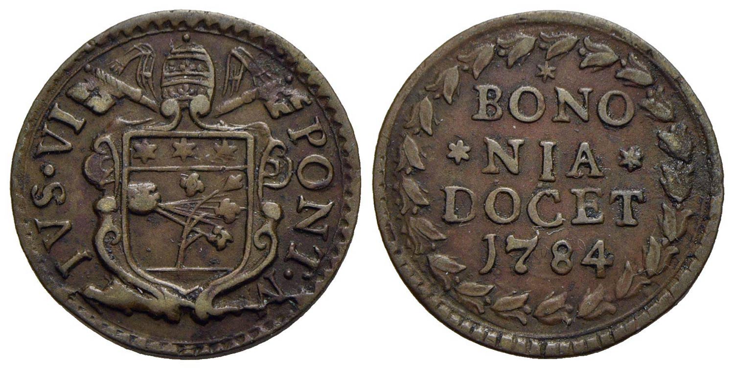 BOLOGNA - Pio VI (1775-1799) - Quattrino - 1784 - (CU g. 2,44) CNI 195; Munt. 298 var. I<br>BB+<br><