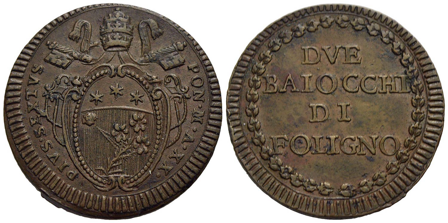 FOLIGNO - Pio VI (1775-1799) - 2 Baiocchi - A. XX - (CU g. 21,95) RR CNI 26; Munt. 331