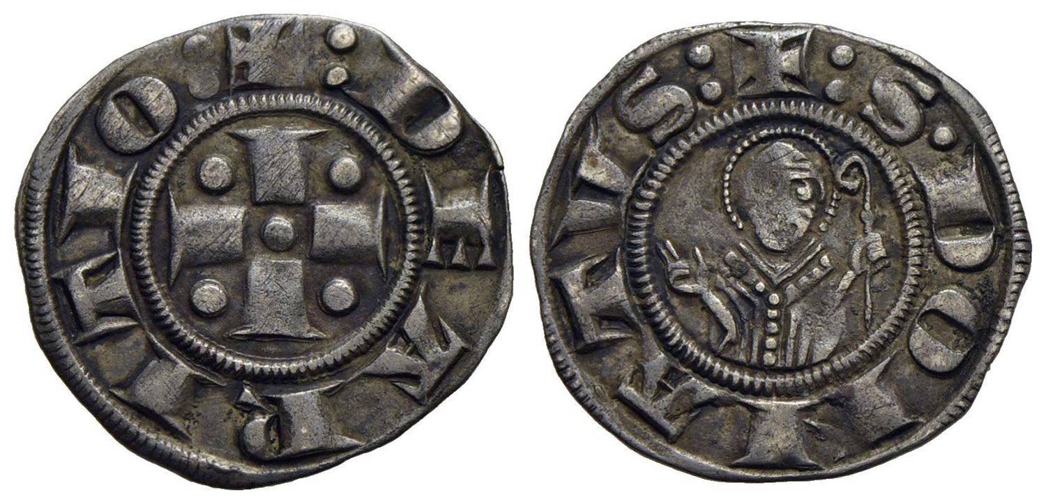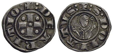 AREZZO - Repubblica (Sec. XIII-XIV) - Grosso - Croce accantonata da quattro globetti - R/ Busto di fronte di San Donato - (AG g. 1,34) NC CNI 13/15; MIR 8