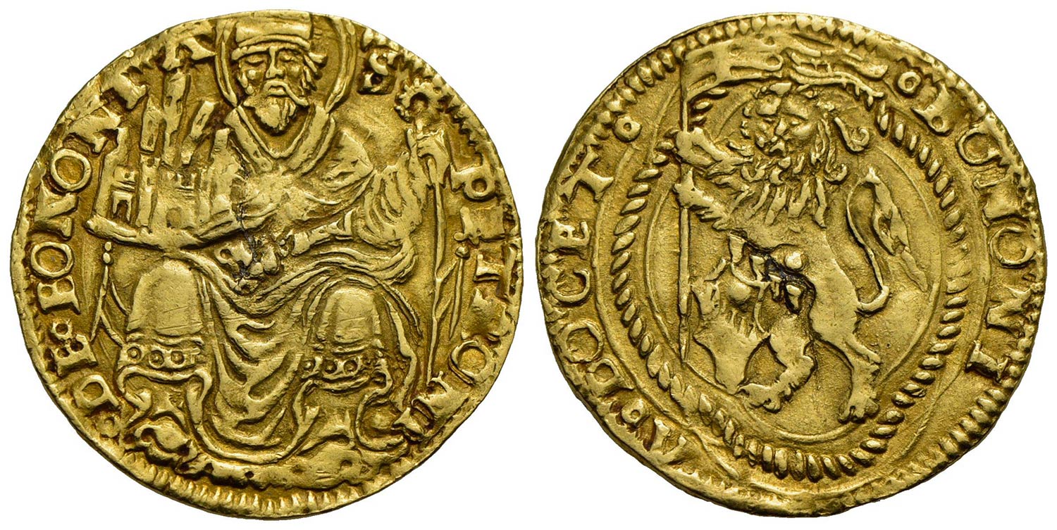 BOLOGNA - Anonime dei Bentivoglio (1446-1506) - Doppio Bolognino d'oro - Leone rampante a s. con vessillo - R/ San Petronio nimbato seduto con pastorale - (AU g. 6,9) R CNI 1/18; MIR 20