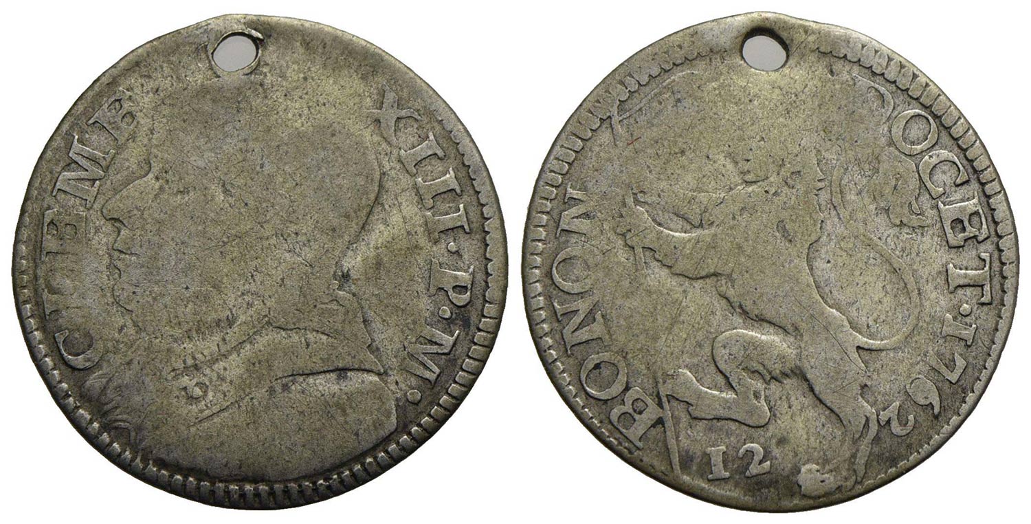 BOLOGNA - Clemente XIII (1758-1769) - Bianco - 1762 - Busto a s. con camauro - R/ Leone vessillifero rampante a s. - AG RR CNI 7; Munt. 43b Forato