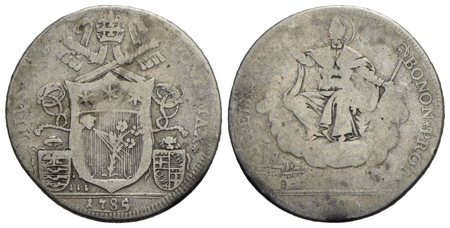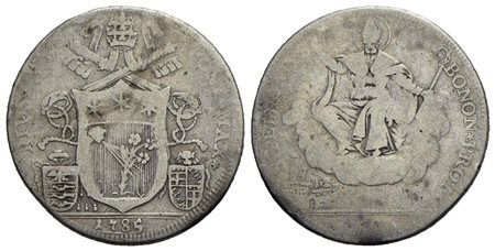 BOLOGNA - Pio VI (1775-1799) - Mezzo scudo romano - 1785 - AG RRR CNI 201; Munt. 209 var. I Diametro mm. 33 Di rara apparizione e sempre in bassa conservazione