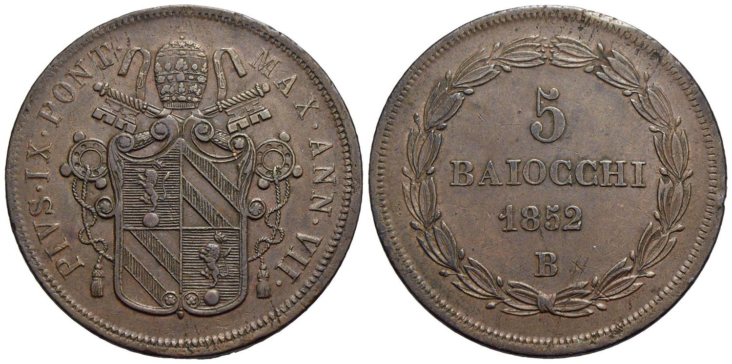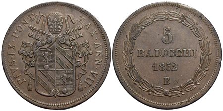 BOLOGNA - Pio IX (1846-1866) - 5 Baiocchi - 1852 A. VII - CU Pag. 300; Mont. 258<br>BB+