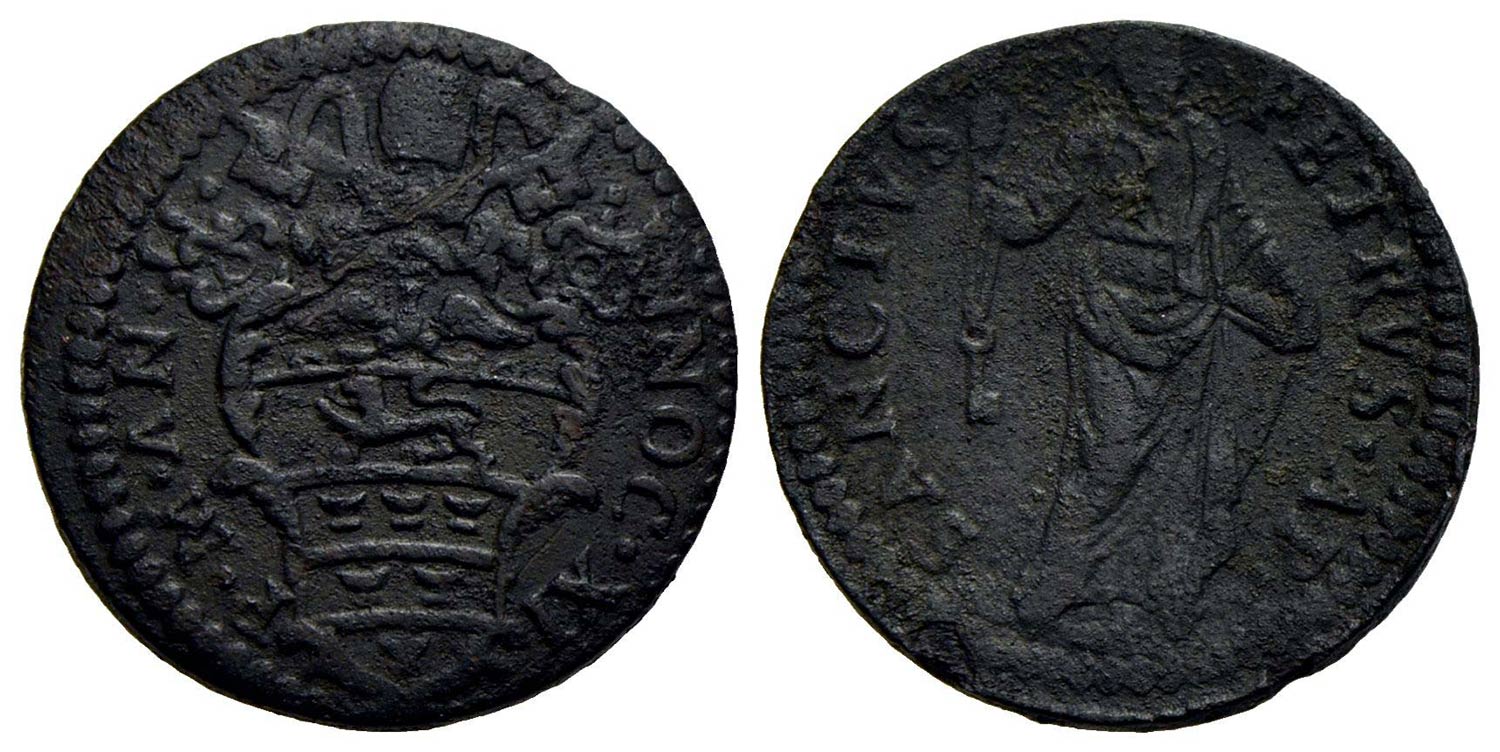 GUBBIO - Innocenzo XI (1676-1689) - Quattrino - A. II - Stemma a cuore sagomato con fogliami - R/ San Pietro volto a d. con chiavi nella d. alzata - (CU g. 2,91) R CNI 12; Munt. 271