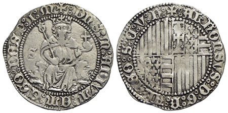 NAPOLI - Alfonso I d'Aragona (1442-1458) - Carlino - Il Re in trono; a s. S - R/ Stemma inquartato - (AG g. 3,61) P.R. 3e; MIR 54/6