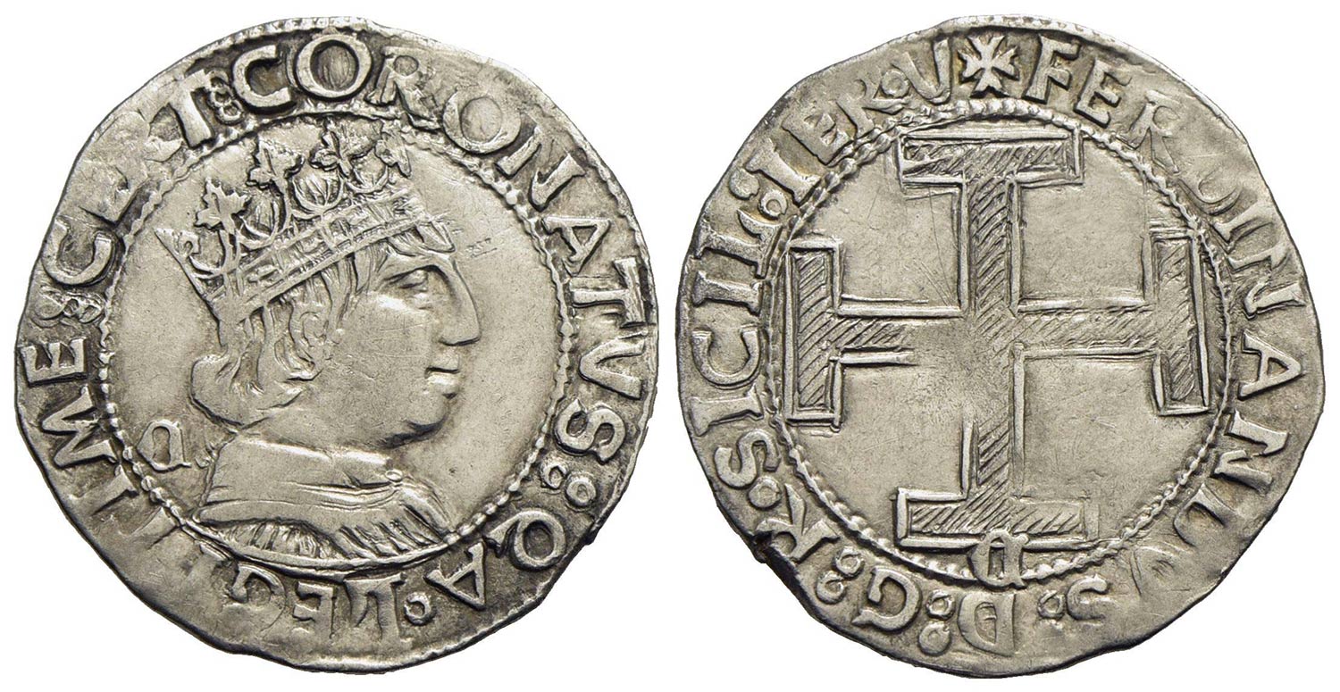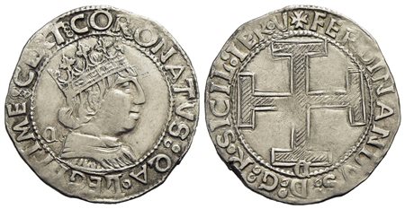 NAPOLI - Ferdinando I d’Aragona (1458-1494) - Coronato - Busto coronato a d. con C gotica dietro al busto - R/ Croce potenziata; sotto C gotica - (AG g. 3,95) P.R. 15m; MIR 68/12