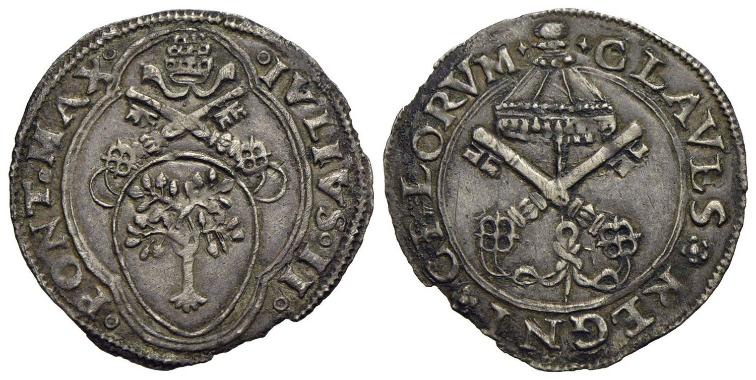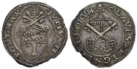 ROMA - Giulio II (1503-1513) - Mezzo giulio - Stemma a cuore in quadrilobo - R/ Chiavi decussate sormontate da padiglione - (AG g. 1,75) RRR CNI 175; Munt. 36 Estremamente raro e in ottimo stato di conservazione