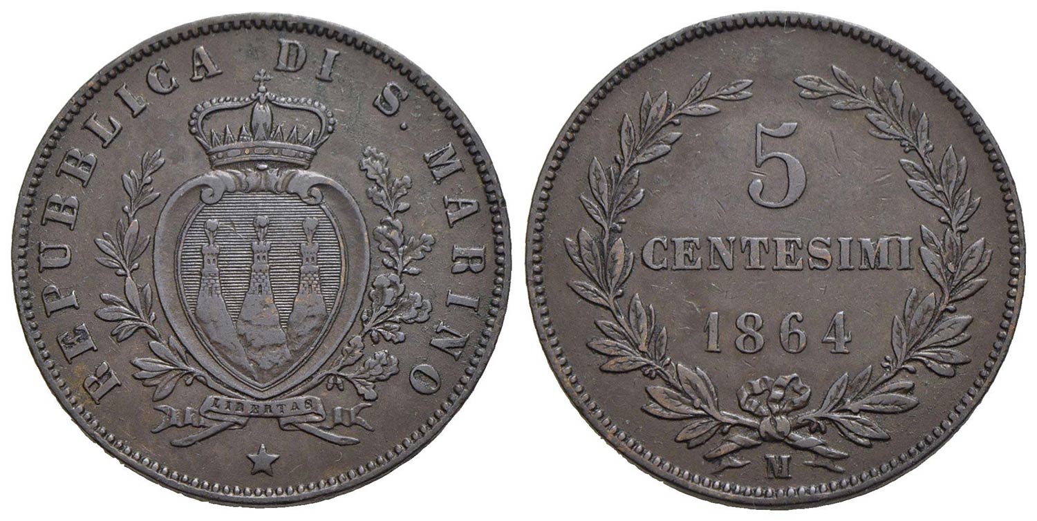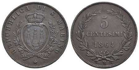 SAN MARINO - Vecchia monetazione - 5 Centesimi - 1864 M - CU R Pag. 377; Mont. 10<br>qFDC