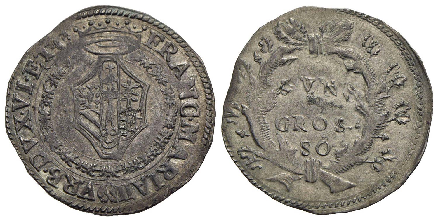 URBINO - Francesco Maria II della Rovere (1574-1624) - Grosso - Stemma coronato - R/ Scritta entro ramo di quercia - (AG g. 2,3) CNI 150/177 Conservazione superiore alla media