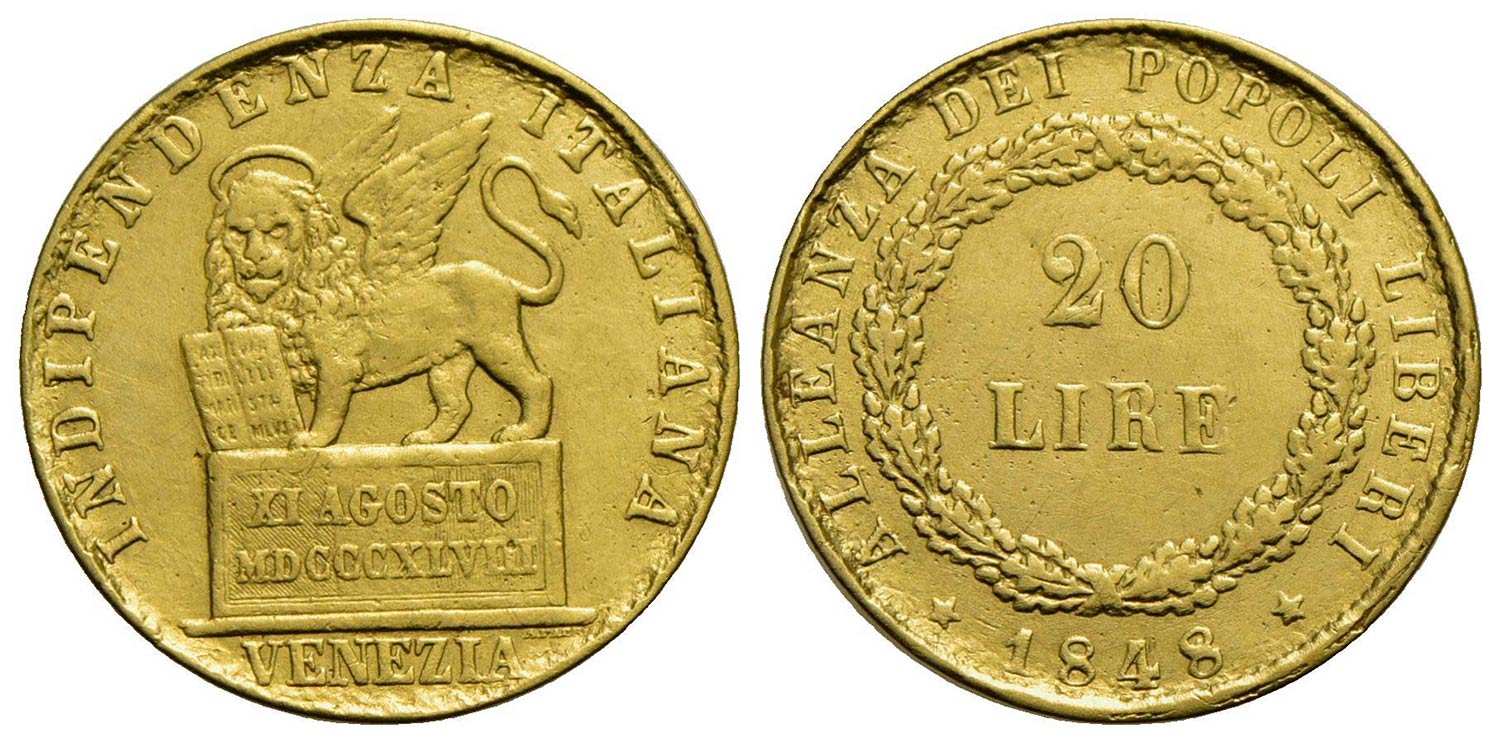 VENEZIA - Governo Provvisorio (1848-1849) - 20 Lire - 1848 - AU RR Pag. 176; Mont. 89 Incastonatura