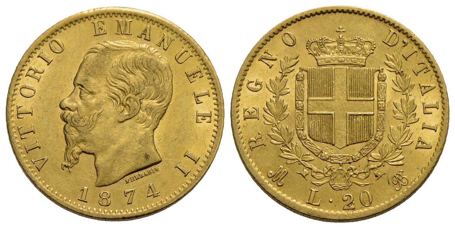 Vittorio Emanuele II Re d'Italia (1861-1878) - 20 Lire - 1874 M - AU Pag. 470; Mont. 146<br>SPL+/FDC