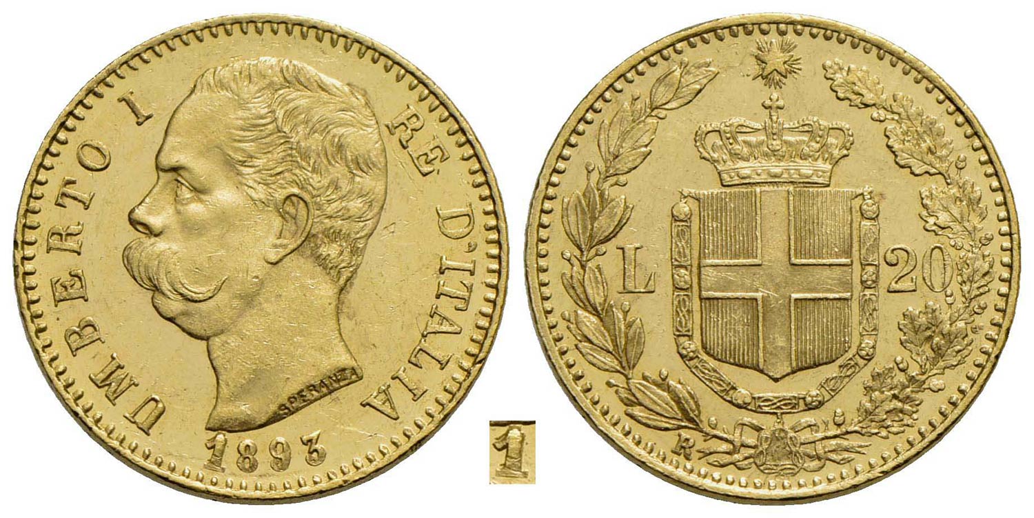 Umberto I (1878-1900) - 20 Lire - 1893 - AU RR Pag. manca; Mont. 30 1 ribattuto<br>qFDC