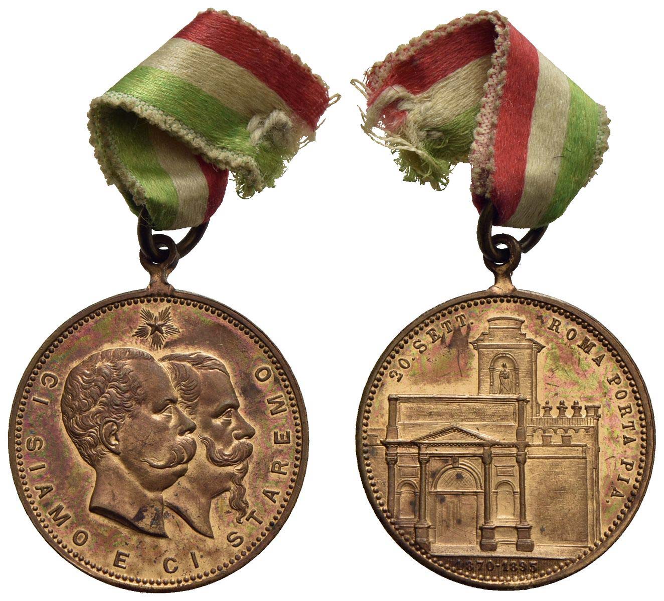 SAVOIA - Vittorio Emanuele II Re d'Italia (1861-1878) - Medaglia - 1870-1885 - Ci siamo e ci saremo - Teste di Vittorio Em. II e Umberto I a d. - R/ Porta Pia Ø: 28 mm. - Cu Proof Con appiccagnolo, anella e nastrino tricolore, in scatolina Lorioli