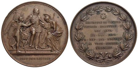 SAVOIA - Vittorio Emanuele II Re d'Italia (1861-1878) - Medaglia - 1871 - Roma Capitale - Il Re tra un angelo che gli presenta la corona e l'Italia in genuflessione - R/ Scritta e data in sette righe entro corona di alloro Opus: C. Moscetti Ø: 75 mm. - (Ae g. 179,2) - Martini 3008