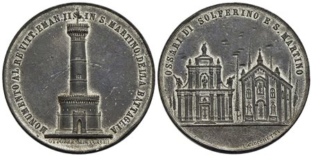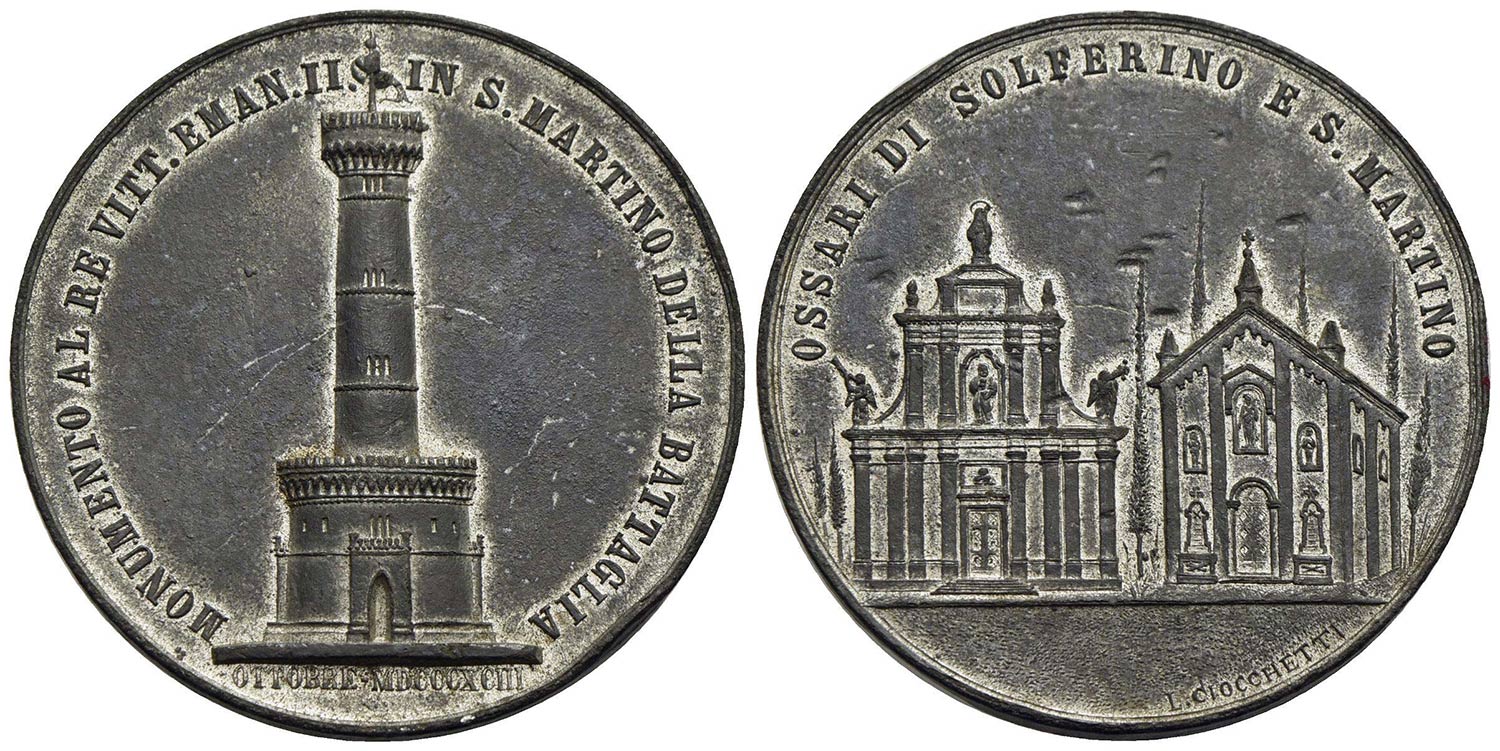 SAVOIA - Umberto I (1878-1900) - Medaglia - 1893 - Monumento a San Martino - Prospetto anteriore della Torre-Monumento e ossario - R/ Viste anteriori appaiati delle chiese di San Martino e Solferino Opus: Ciocchetti Ø: 59 mm. - (MB g. 66,7) Martini 3494