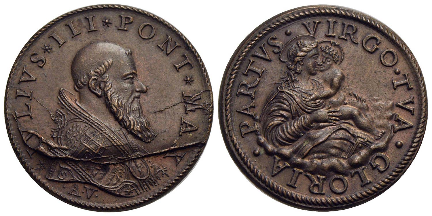 PAPALI - Giulio III (1550-1555) - Medaglia - A. V - Busto con piviale a d. - R/ La Vergine col Bambino Ø: 30 mm. - (AE g. 14,7) Difetto al D/